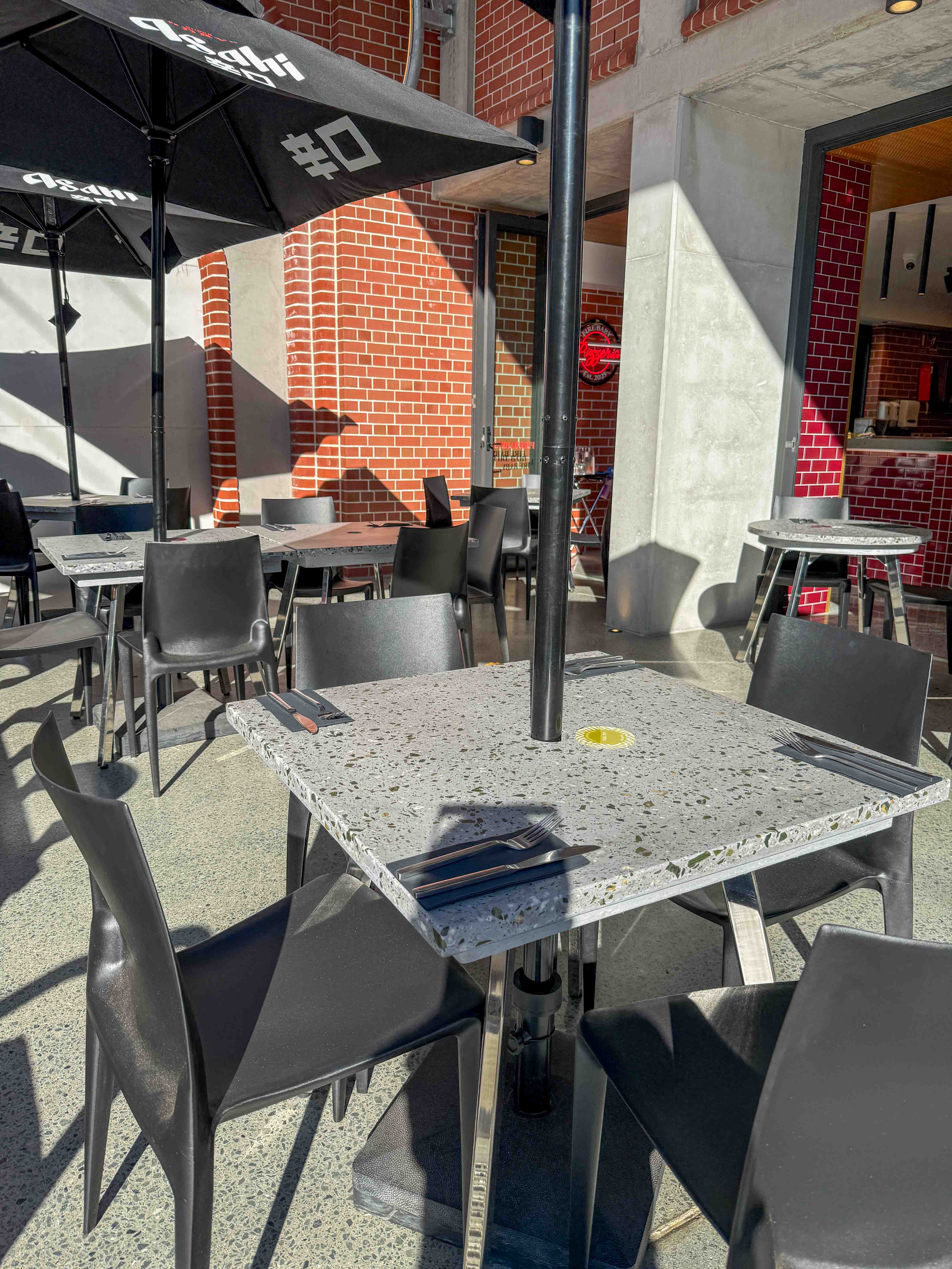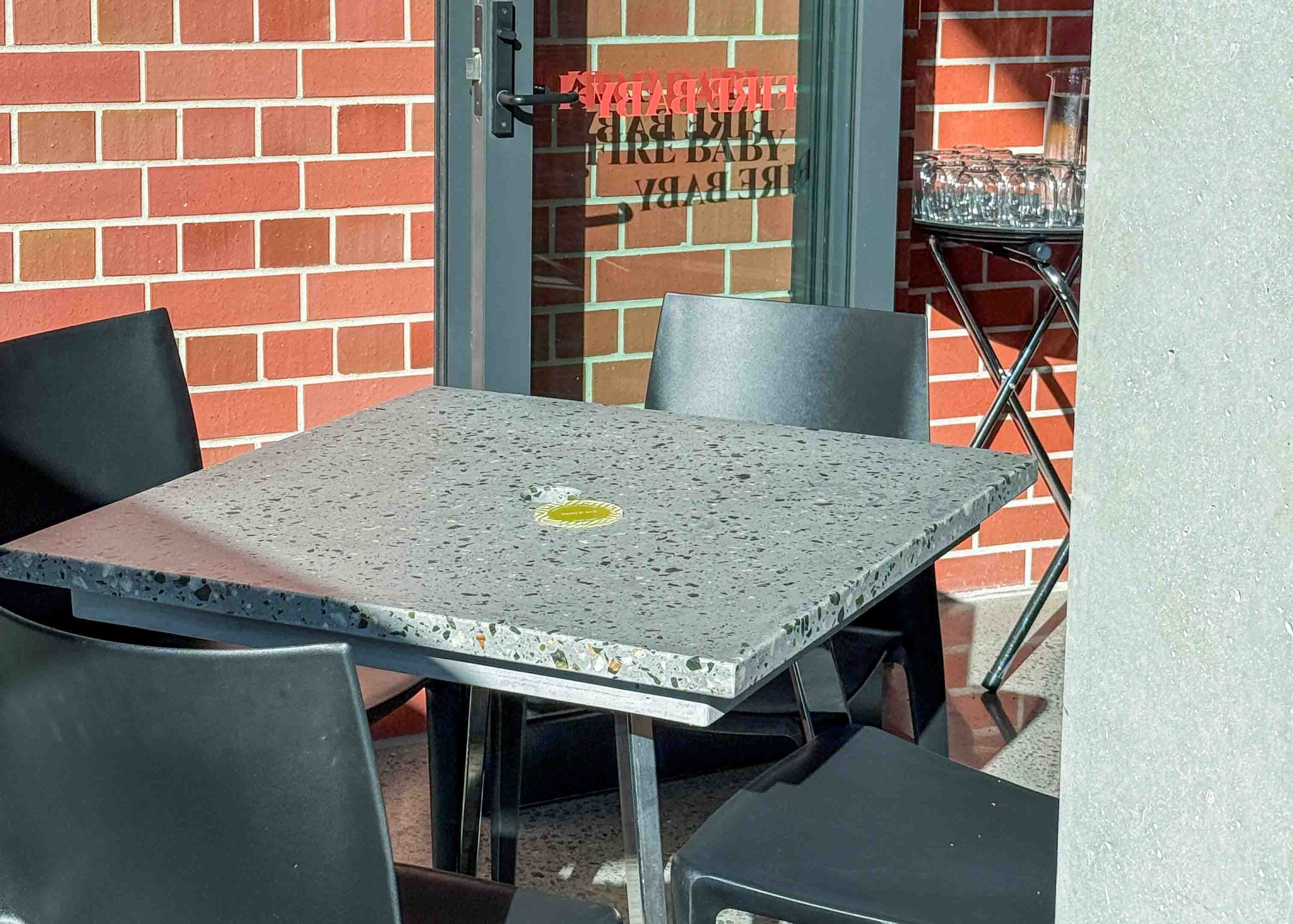 Firebaby, a vibrant new restaurant in the heart of Southport, features a collection of our custom concrete pieces — designed to balance durability, bold colour, and refined texture. From dining tables in moss green trowel finish, to charcoal concrete bar tops, polished vanities, and terrazzo outdoor tables, each piece was carefully crafted to bring depth and timeless design to the venue’s aesthetic.